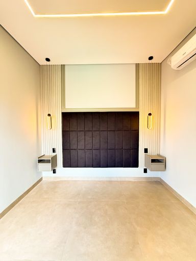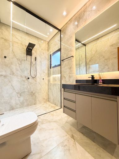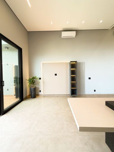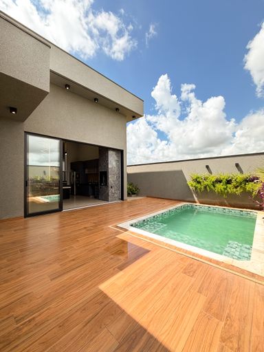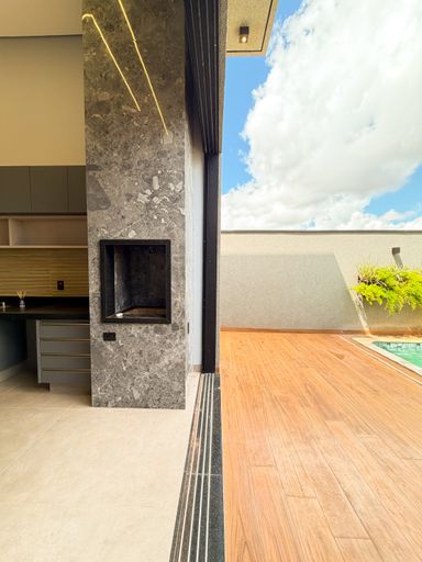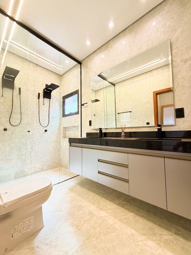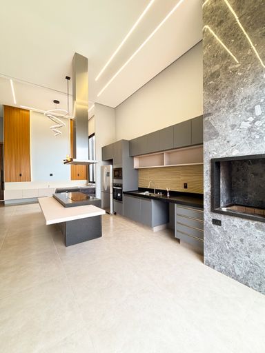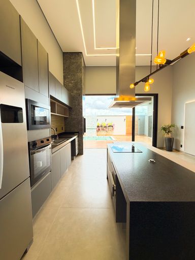 3 suítes , sendo 1 master com closet amplo , pias e chuveiros duplos , escritório , sala com pé direito alto , cozinha integrada ao gourmet , piscina aquecida com cascata , banheiro externo
