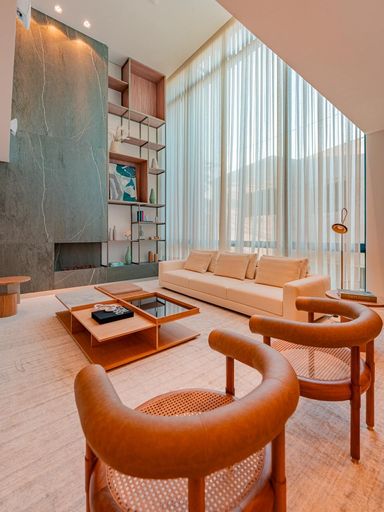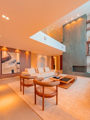 Living principal integrado, sala de estar com lareira e jantar com opção de deixar a cozinha integrada ou não por sua porta embutida