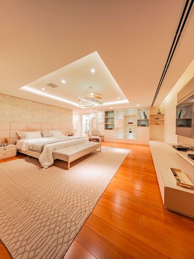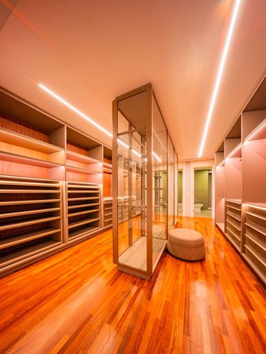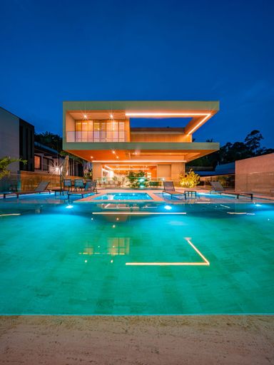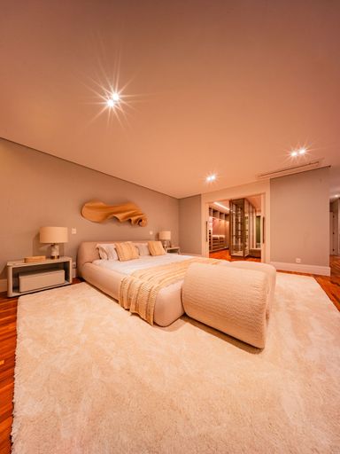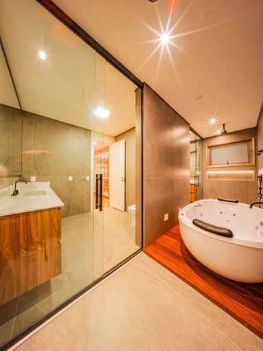 5 suítes, no pavimento superior, sendo a máster com closet e banheiro duplo interligado por hidromassagem