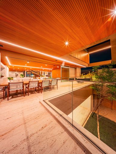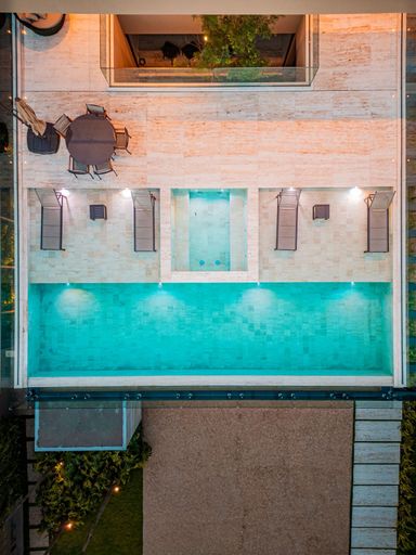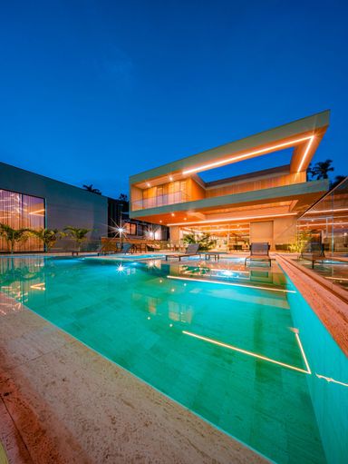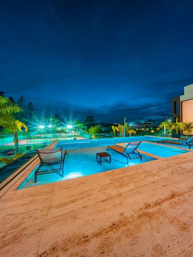 Piso térreo, inferior e dentro da piscina revestido em Mármore Travertino bruto