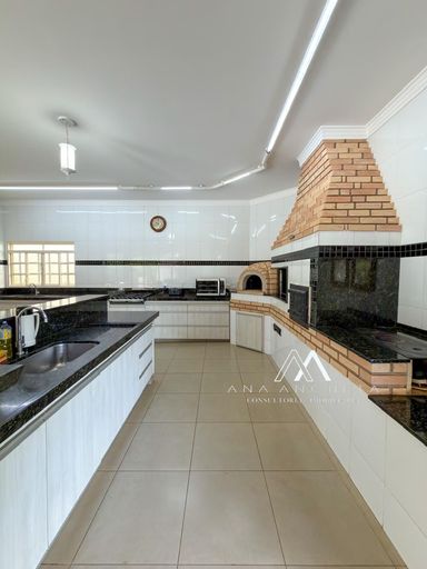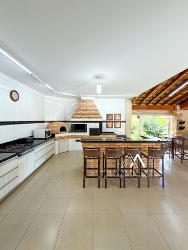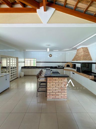 Salão de festas com churrasqueira e forno de pizza