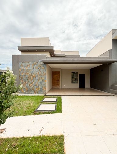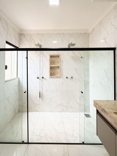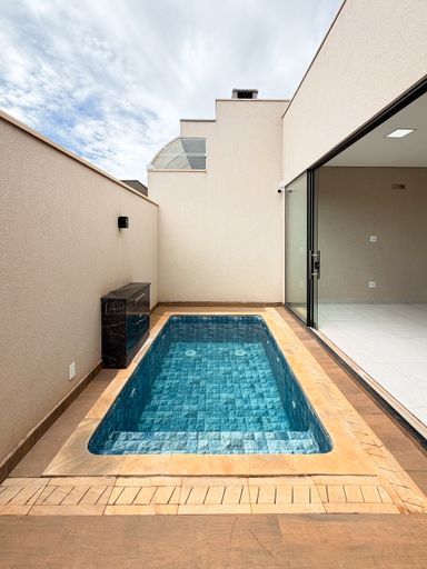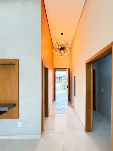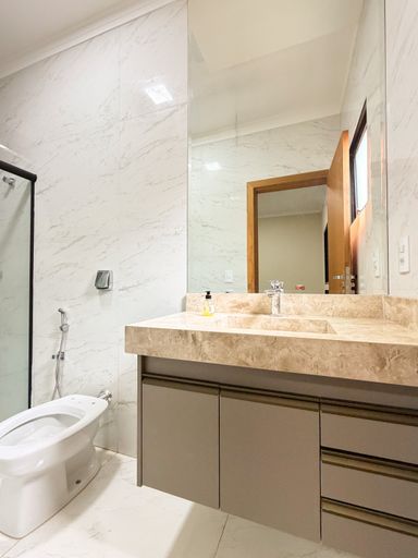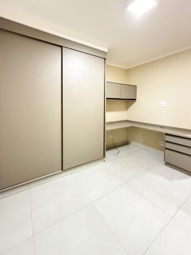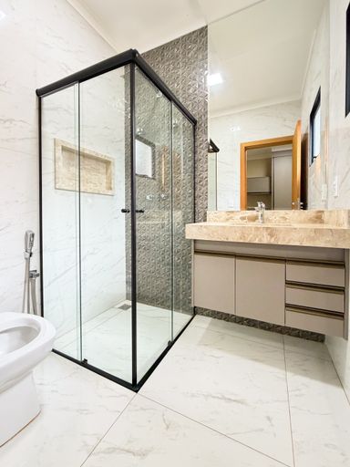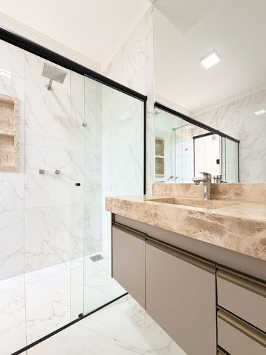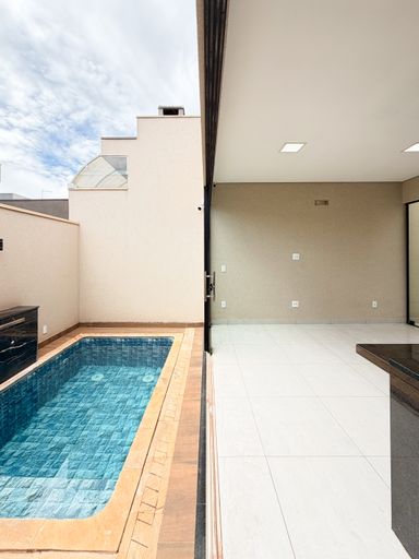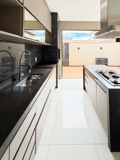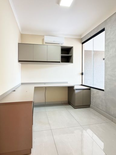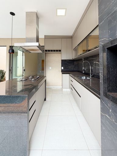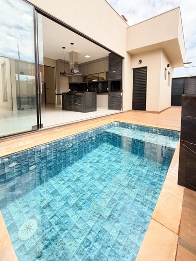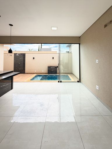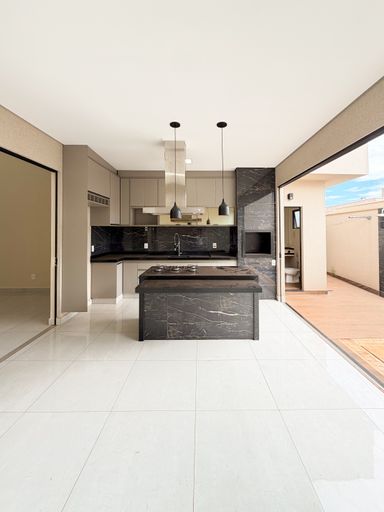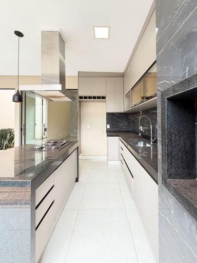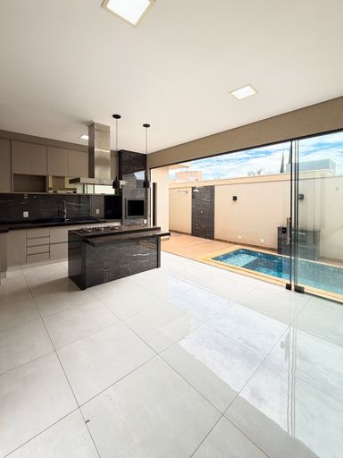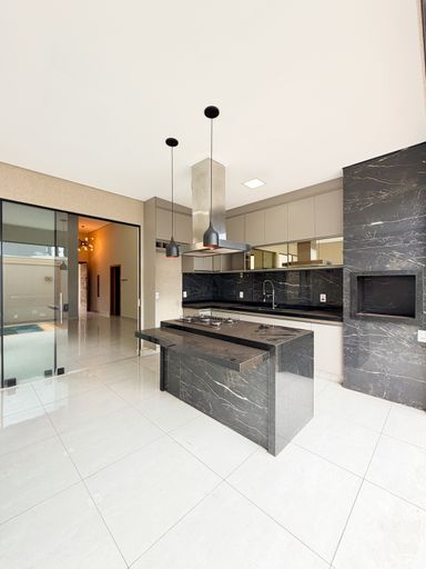 3 suítes , sendo 1 master com closet e duchas duplas Escritório Sala 2 ambientes Pé direito duplo Gourmet integrado Marcenaria completa WC externo Lavanderia Armários externos Climatizada 2 vagas de garagem coberta