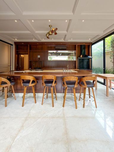 Espaço Gourmet revestido Madeira natural. Balcão refrigerado. Mármores é completamente climatizado