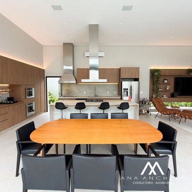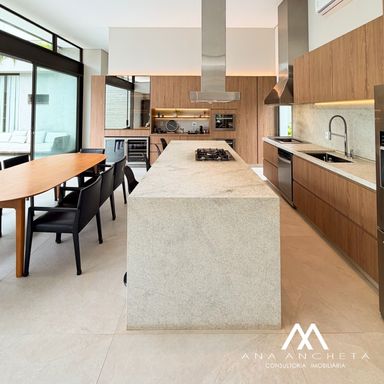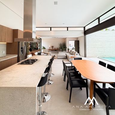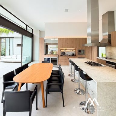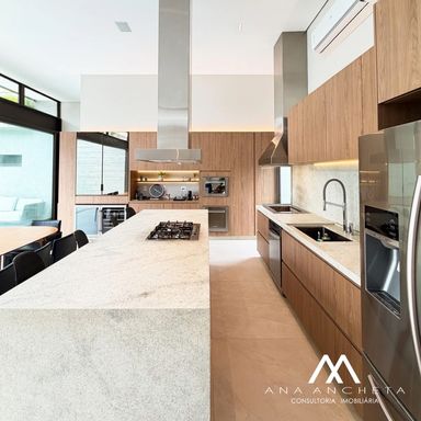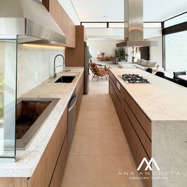 Cozinha com churrasqueira, coifas, cooktop e fornos de micro-ondas e elétrico
