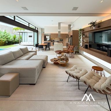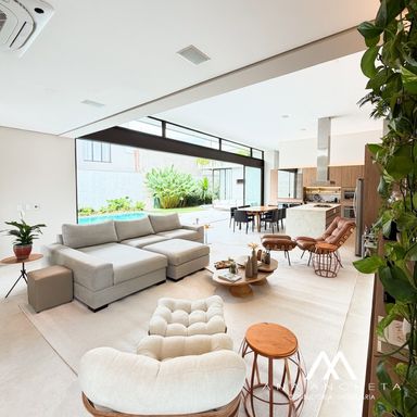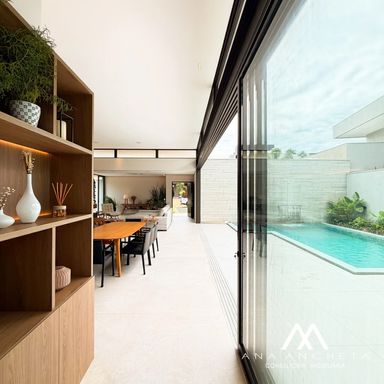 Sistema de som com caixas embutidas no teto da sala e área gourmet e área da piscina