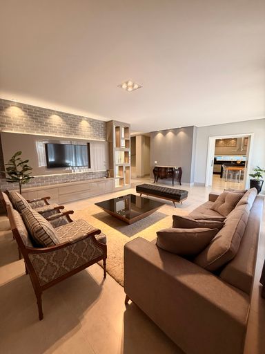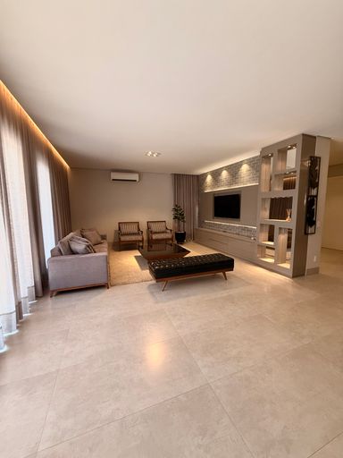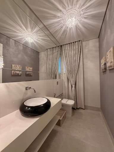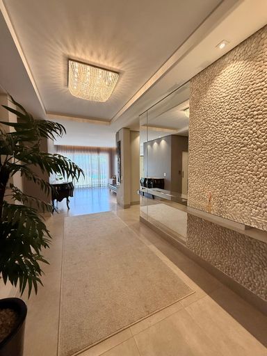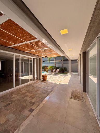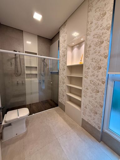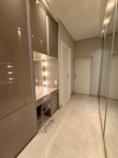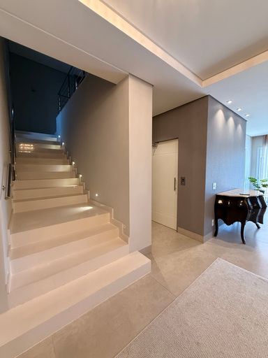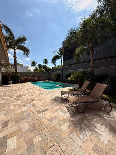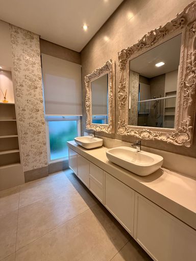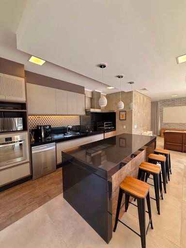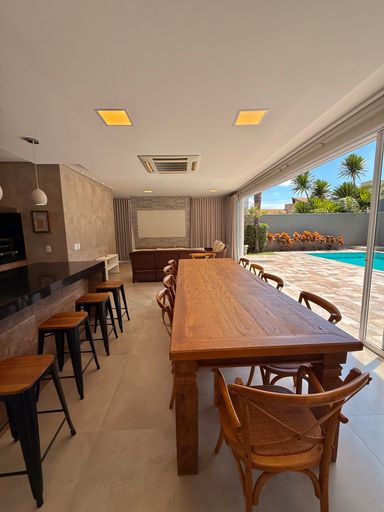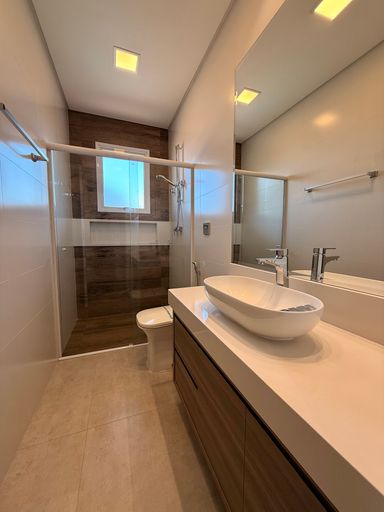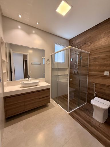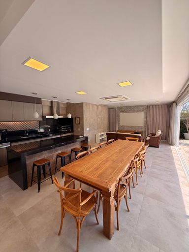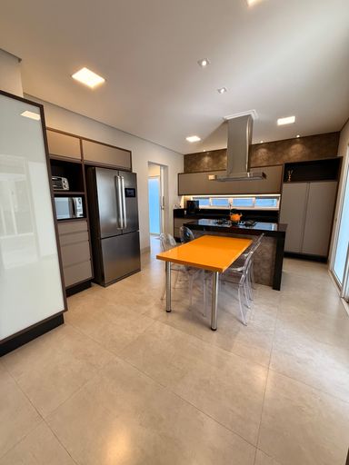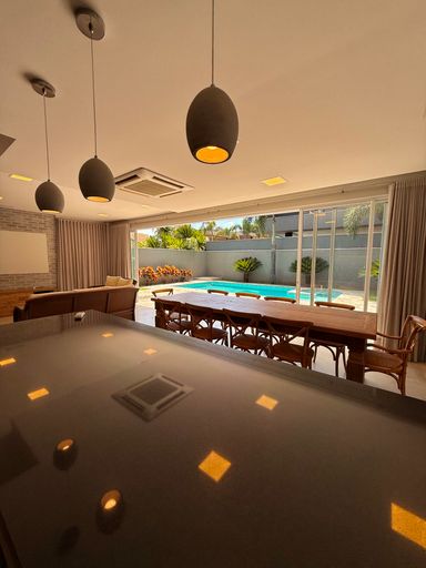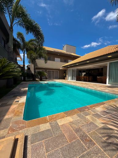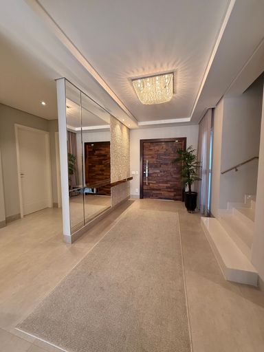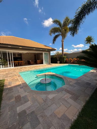 4 suítes , sendo 3 no piso superior , 1 master no térreo com closet , banheiro 2 cubas e 2 chuveiros , cozinha separada , gourmet completo com chopeira , piscina aquecida com hidro , lavandeira ampla , rica em armários externos.